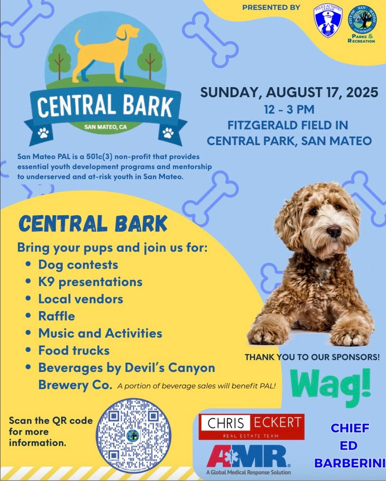 Get ready THIS SUNDAY for tail wags and community fun at Central Bark, hosted by San Mateo Police Activities League (San Mateo PAL) in partnership with San Mateo Parks & Recreation! The event takes place Sunday, August 17, 2025, from 12 noon–3 PM at Fitzgerald Field in Central Park, San Mateo.